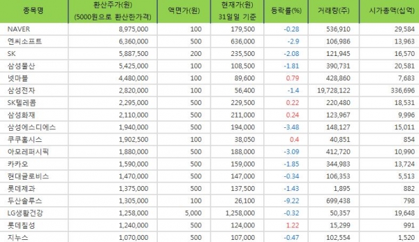 ▲ (1위) NAVER 환산주가 : 8975000원(액면가 5000원으로 환산한 주가), 1주당 액면가 : 100원, NAVER 31일일 현재주가 : 179500원 (-0.28% 상승), 시가총액 : 29584십억원, NAVER 31일일 거래량 : 536910주.