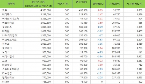 [표](31일 장마감 기준) 코스닥 환산주가 순위 Top 30 (액면 5000원 환산가격).