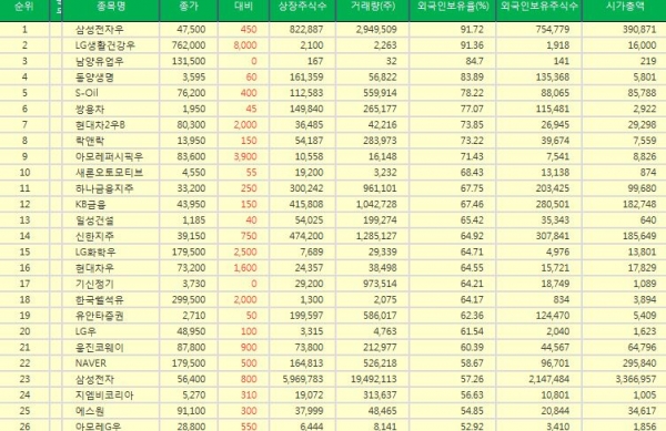 외국인 보유율이 높은 종목은 31일 종가 기준으로 삼성전자우(외국인보유율(누적 순매수) : 약 91.72%, 현재가 : 47500원), LG생활건강우(외국인보유율 : 약 91.36%, 현재가 : 762000원), 남양유업우(외국인보유율(누적 순매수) : 약 84.7%, 현재가 : 131500원)으로 나타났다. 주식 외국인 보유율 시장 흐름을 판단하는 주요 지표 중 하나다. 외국인 보유율은 상장 총주식수 대비 해당일 기준일 현재 보유 비율을 말하며 외국인 보유율이 높은 종목은 추세 판단에 도움이 된다.