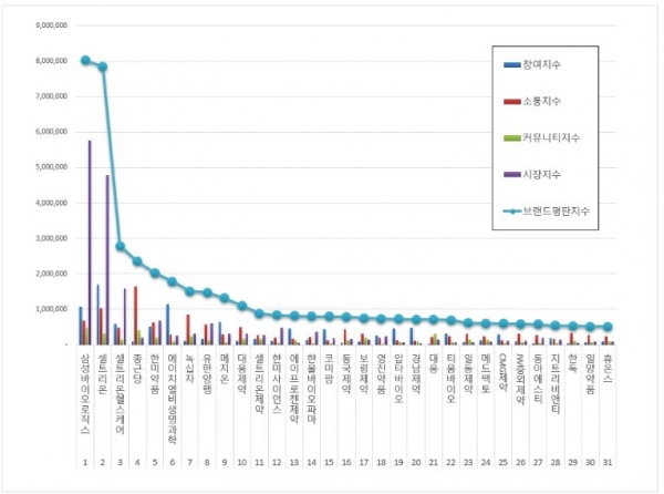 1위, 삼성바이오로직스 ( 대표 김태한 ) 브랜드는 참여지수 1,075,834 소통지수 690,610 커뮤니티지수 483,827 시장지수 5,770,606가 되면서 브랜드평판지수 8,020,878로 분석되었다. 지난 2019년 11월 브랜드평판지수 7,064,915 와 비교하면 13.53% 상승했다.
