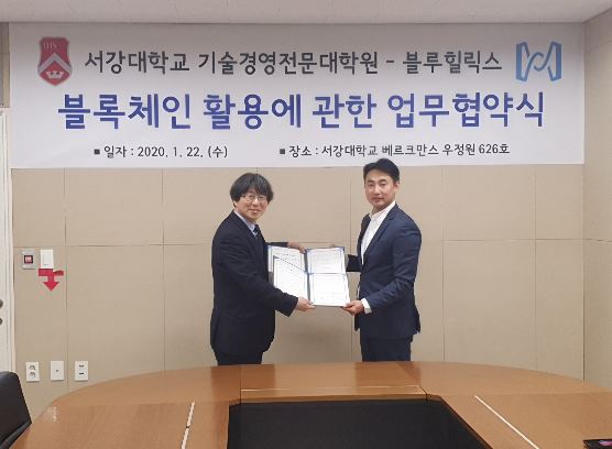 블록체인 기반 클라우드 기업 블루힐릭스코리아(공동대표 : 이상욱, 채훈)는 서강대학교 기술경영대학원과 블록체인 공동연구개발을 위한 업무협약을 체결했다고 밝혔다.