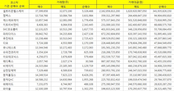 이 밖에 10위에서 20위 기관 순매수 종목으로는 이오테크닉스(약 454억원, 57만주 순매수), 메디톡스(약 424억원, 3만주 순매수), 비에이치(약 349억원, 112만주 순매수), 삼천당제약(약 346억원, 73만주 순매수), 원익홀딩스(약 322억원, 642만주 순매수), 원익QnC(약 297억원, 195만주 순매수), 위메이드(약 288억원, 48만주 순매수), 와이솔(약 263억원, 130만주 순매수), 에코마케팅(약 261억원, 165만주 순매수), 쎄트렉아이(약 245억원, 112만주 순매수) 종목이 기록했다.