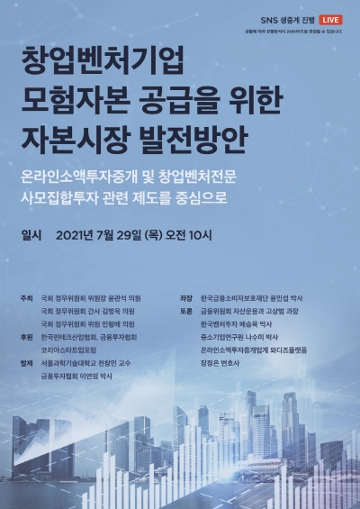 국회 정무위원회 윤관석, 김병욱, 민형배 의원이 공동 주최하며, 토론회 좌장은 한국금융소비자보호재단 윤민섭 박사가 맡는다. 서울과학기술대학교 천창민 교수, 금융투자협회 이연임 박사의 발제에 이어 금융위원회 자산운용과 고상범 과장, 한국벤처투자 배승욱 박사, 중소기업연구원 나수미 박사, 업계 와디즈 장정은 변호사가 참석해 토론을 진행한다.