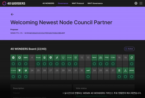 위믹스 재단이 위믹스3.0(WEMIX3.0) 메인넷의 노드 카운슬 파트너(Node Council Partner)인 '40원더스(WONDERS)' 영입을 위한 거버넌스 투표를 시작했다.