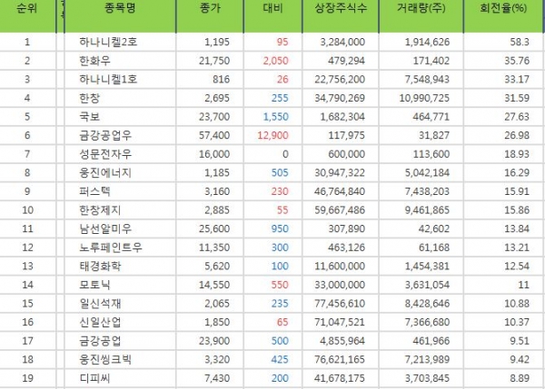 회전율이 높은 종목은 15일 종가 기준으로 하나니켈2호(회전율 : 약 58.3%, 현재가 : 1195원), 하나니켈1호(회전율 : 약 33.17%, 현재가 : 816원), 금강공업우(회전율 : 약 26.98%, 현재가 : 57400원)으로 나타났다. 주식 회전율은 시장 흐름을 판단하는 주요 지표 중 하나다. 회전율은 상장 총주식수 대비 해당일 하루거래량의 비율을 말하며 회전율이 높은 종목은 손바뀜이 활발해 추세 판단에 도움이 된다.