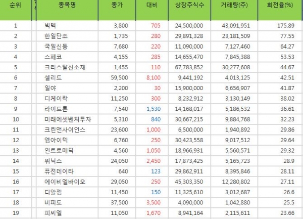 회전율이 높은 종목은 15일 종가 기준으로 빅텍(회전율 : 약 175.89%, 현재가 : 3800원), 국일신동(회전율 : 약 64.27%, 현재가 : 7680원), 셀리드(회전율 : 약 42.51%, 현재가 : 59500원)으로 나타났다. 주식 회전율은 시장 흐름을 판단하는 주요 지표 중 하나다. 회전율은 상장 총주식수 대비 해당일 하루거래량의 비율을 말하며 회전율이 높은 종목은 손바뀜이 활발해 추세 판단에 도움이 된다.