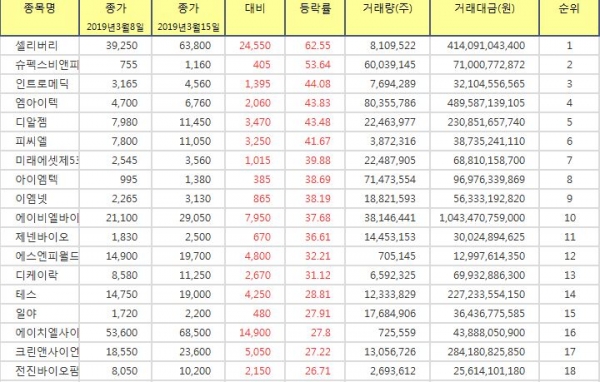 지난 2019년 3월 8일부터 3월 15일까지 주간 상승률 최고 종목은 셀리버리(거래량 : 약 8109천주, 현재가 : 63800원), 슈펙스비앤피(거래량 : 약 60039천주, 현재가 : 1160원), 인트로메딕(거래량 : 약 7694천주, 현재가 : 4560원)으로 나타났다. 주식 거래량은 시장 흐름을 판단하는 주요 지표 중 하나다. 거래량은 가격보다 먼저 움직이기 때문에 시장 흐름은 주가와 거래량을 함께 봐야 추세 판단에 도움이 된다.
