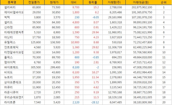 ▲ (1위) 셀리버리 18일 거래금액 : 2028억원 (장마감 기준), 거래량 : 2788천주, 셀리버리 18일 주가(주식가격) : 73500원 (15.2% 상승, 9700원 상승), 셀리버리 전거래일 주가 : 63800원.