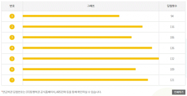 동행복권은 회차별 조 당첨횟수를 공개했다. 402회차까지 동행복권이 공개한 조별 1등과 2등 당첨횟수는 1조가 94회, 2조가 116회, 3조가 106회, 4조가 126회, 5조가 132회, 6조가 109회, 7조가 121회를 각각 차지했다.제403회차 연금복권 520 당첨번호는 수요일 오후 7시 40분 추첨시간에 연금복권당첨번호조회 결과가 공개된다.