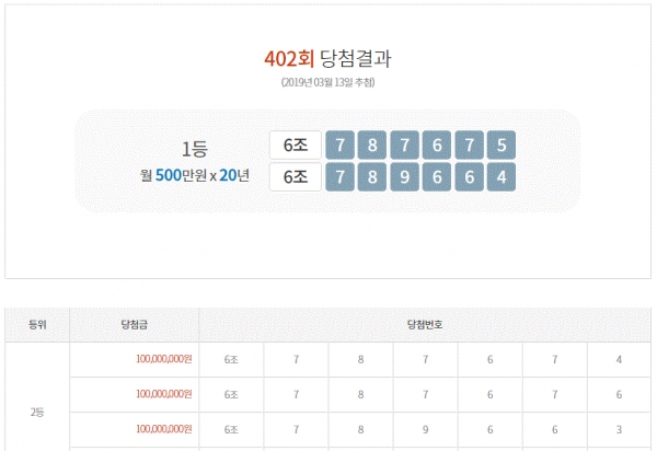 (제402회차) 동행복권에 따르면 제402회차 1등 당첨번호는 "6조787675"와 "6조789664"번호이다. 연금복권당첨번호 제402회차에서 2등 당첨번호는 6조787674, 6조787676, 6조789663, 6조789665번이다. 3등과 4등 당첨번호는 각각 각조819611, 각조-22798번이다. 당첨번호 5등은 각조 끝자리가 433번, 당첨번호 6등은 각조 끝자리가 48번과 36번이다. 당첨번호 7등은 각조 끝자리가 7번과 6번이다.