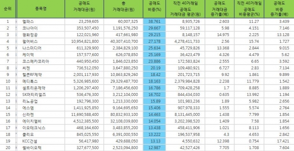 [표](19일기준) 코스닥 공매도 특징주 Top 25 (전일 장마감 한국거래소 기준/시간외일부포함)