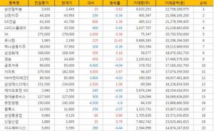 한편, 퍼스텍(1.69%,3010원, 상승, 퍼스텍 거래량 146%), 모나리자(-0.9%,4420원, 하락, 모나리자 거래량 195%), 인스코비(0.93%,5410원, 상승, 인스코비 거래량 103%), 한창제지(0%,2875원, 상승, 한창제지 거래량 46%), 보해양조(-2.38%,1640원, 하락, 보해양조 거래량 55%), 에이엔피(1.71%,536원, 상승, 에이엔피 거래량 70%), 미래산업(-1.26%,157원, 하락, 미래산업 거래량 42%), 한국전력(-3.89%,32150원, 하락, 한국전력 거래량 73%), 일신석재(-2.05%,2150원, 하락, 일신석재 거래량 37%), 삼성중공업(-2.19%,8920원, 하락, 삼성중공업 거래량 65%) 장중 거래를 기록하고 있다.