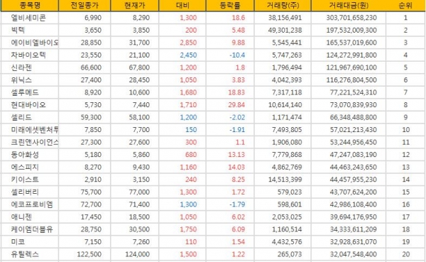 [표](20일현재) 거래금액 코스닥 Top 20 (전거래일 현재/시간외일부포함)