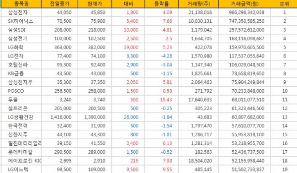 ▲ (1위) 삼성전자 21일 거래금액 : 9662억원 (장마감 기준), 거래량 : 21138천주, 삼성전자 21일 주가(주식가격) : 45850원 (4.09% 상승, 1800원 상승), 삼성전자 전거래일 주가 : 44050원.