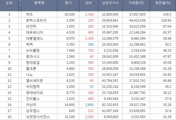 종목 회전율 10위권대를 기록한 종목은 나노(회전율 : 약 41.83%, 현재가 : 2825원), 엘비세미콘(회전율 : 약 40.68%, 현재가 : 8130원), 아이엠텍(회전율 : 약 39.2%, 현재가 : 1050원), 현대바이오(회전율 : 약 38.22%, 현재가 : 8770원), 인터불스(회전율 : 약 37.8%, 현재가 : 2025원)이다.