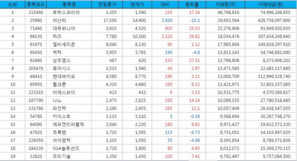 [표](22일기준) 코스닥 거래량 Top 30 (전일 장마감 기준)