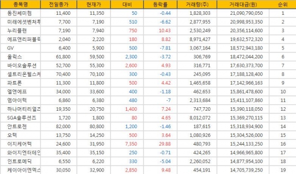 [표](22일현재) 거래금액 코스닥 Top 20 (전거래일 현재)