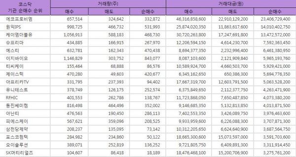 한편, 기관은 웹케시(약 28억원, 6만주 순매수), 테스나(약 28억원, 8만주 순매수), 위메이드(약 27억원, 5만주 순매수), 와이솔(약 26억원, 16만주 순매수), 하나머티리얼즈(약 26억원, 12만주 순매수), 비에이치(약 23억원, 8만주 순매수), 에이스테크(약 23억원, 37만주 순매수), 파워로직스(약 22억원, 23만주 순매수), 케이아이엔엑스(약 21억원, 8만주 순매수), 테스(약 21억원, 10만주 순매수) 종목을 매수해 기관 순매수 상위 30위권을 기록했다.