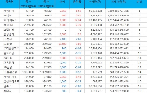 지난 2019년 3월 18일부터 3월 22일까지 주간 거래금액 최다 종목은 삼성전자(거래금액 : 약 26698억원, 현재가 : 46550원), 코웨이(거래금액 : 약 17588억원, 현재가 : 96900원), SK하이닉스(거래금액 : 약 17074억원, 현재가 : 76100원)으로 나타났다.
