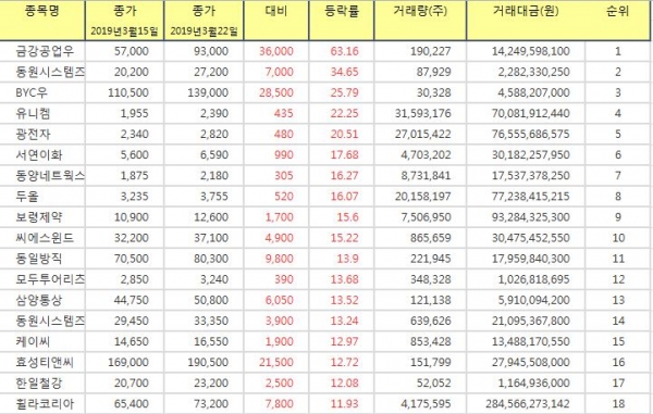 ◇ (주간/종합) 코스피 주간 상승률 Top 20 (2019년 3월 15일 ~ 3월 22일/주가 현황).