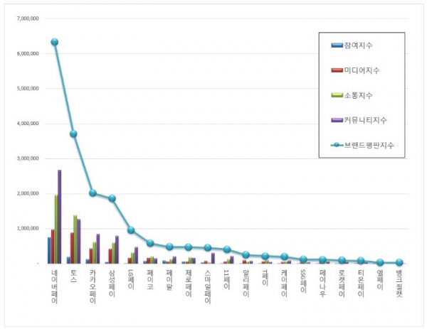 1위, 네이버페이 브랜드는 참여지수 749,322 미디어지수 967,732 소통지수 1,957,871 커뮤니티지수 2,669,341가 되면서 브랜드평판지수 6,344,265가 되었다. 지난 2월 브랜드평판지수 5,849,005와 비교하면 7.81% 상승했다.