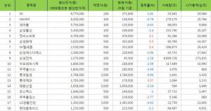 [표](주간 Top 20) 코스피,코스닥 환산주가 순위 (액면 5000원 환산가격, 25일 장마감 기준).