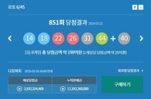 851회 1등 당첨금 24억,당첨번호는 14,18,22,26,31,44...최근 당첨금 가장 컸던 로또복권당첨번호는?