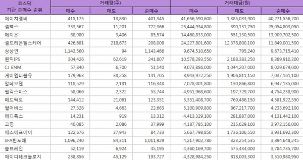 기관은 지난 한주 동안 에이치엘비(약 402억원, 40만주 순매수), 젬백스(약 250억원, 72만주 순매수), 메지온(약 139억원, 8만주 순매수), 셀트리온헬스케어(약 118억원, 20만주 순매수), 상상인(약 96억원, 114만주 순매수), 원익IPS(약 83억원, 24만주 순매수), CJ ENM(약 80억원, 5만주 순매수), 케이엠더블유(약 70억원, 14만주 순매수), 알테오젠(약 69억원, 11만주 순매수), 헬릭스미스(약 47억원, 5만주 순매수)를 했다.