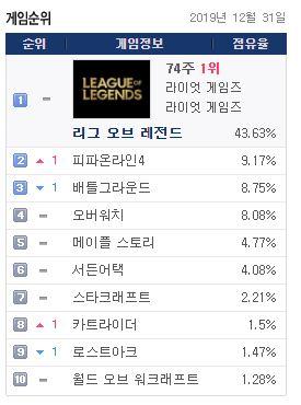 [1일 PC방 RPG온라인게임 점유율 순위] 74주 1위 리그 오브 레전드(롤,lol 인벤) 올라, 피파온라인4 (9.17%) 2위, 배틀그라운드 (8.75%) 3위, 오버워치 (8.08%) 4위, 메이플 스토리 (4.77%) 5위 순으로 기록