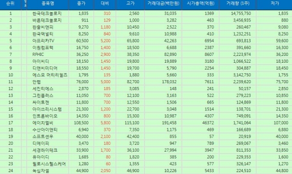 ▲ (11위)안랩, 주가하락률 : 약 -6.17% (거래량= 2239620주), 3일 안랩 5,000원 상승, 시가총액 7611억원, 회전율 : 약 22.36% (=하루거래량/상장총주식수= 2239620주/10014000주), 안랩 주가는 76000원을 기록하며 장마감했고 안랩 종목의 고가와 저가는 각각 82700원, 75700원을 기록했다.