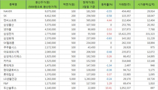 ▲ (1위) NAVER 환산주가 : 9075000원(액면가 5000원으로 환산한 주가), 1주당 액면가 : 100원, NAVER 3일일 현재주가 : 181500원 (-0.55% 상승), 시가총액 : 29914십억원, NAVER 3일일 거래량 : 454492주.
