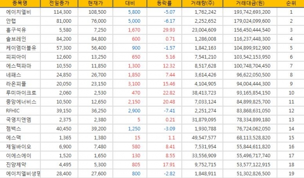 ▲ (1위) 에이치엘비 3일 거래금액 : 1937억원 (장마감 기준), 거래량 : 1762천주, 에이치엘비 3일 주가(주식가격) : 108500원 (-5.07% 하락, 5800원 하락), 에이치엘비 전거래일 주가 : 114300원.