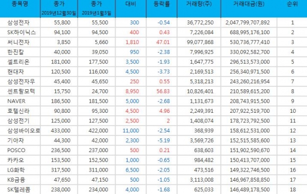 지난 2019년 12월 30일부터 1월 3일까지 주간 거래금액 최다 종목은 삼성전자(거래금액 : 약 20477억원, 현재가 : 55500원), SK하이닉스(거래금액 : 약 6889억원, 현재가 : 94500원), 써니전자(거래금액 : 약 5307억원, 현재가 : 5660원)으로 나타났다.