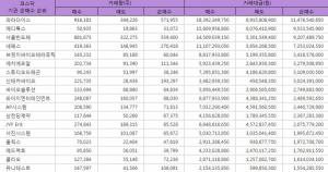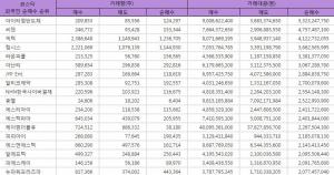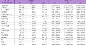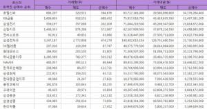같은 기간 주간 거래량 10위권대를 기록한 종목은 호텔신라(거래금액 : 약 2079억원, 현재가 : 95300원), 삼성전기(거래금액 : 약 1787억원, 현재가 : 127500원), 삼성바이오로직스(거래금액 : 약 1586억원, 현재가 : 422000원), 기아차(거래금액 : 약 1525억원, 현재가 : 42000원), POSCO(거래금액 : 약 1519억원, 현재가 : 237000원)이다.