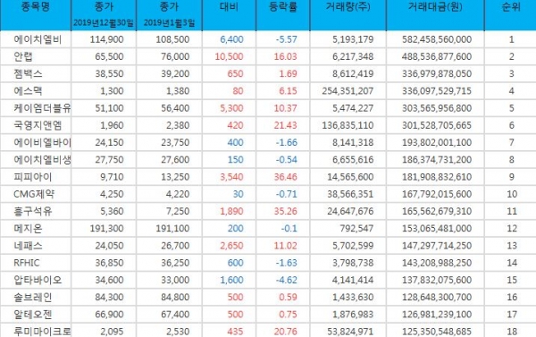 지난 2019년 12월 30일부터 1월 3일까지 주간 거래대금 최다 종목은 에이치엘비(거래대금 : 약 5824억원, 현재가 : 108500원), 안랩(거래대금 : 약 4885억원, 현재가 : 76000원), 젬백스(거래대금 : 약 3369억원, 현재가 : 39200원)으로 나타났다.