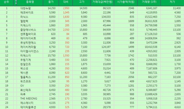 ▲ (1위) 대한뉴팜, 주가상승률 : 약 26.11% (거래량= 6641167주), 6일 대한뉴팜 2,950원 상승, 시가총액 2046억원, 회전율 : 약 46.26% (=하루거래량/상장총주식수= 6641167주/14355000주), 대한뉴팜 주가는 14250원을 기록하며 장마감했고 대한뉴팜 종목의 고가와 저가는 각각 14500원, 11400원을 기록했다.
