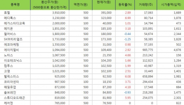 [표](7일 장마감 기준) 코스닥 환산주가 순위 Top 30 (액면 5000원 환산가격).