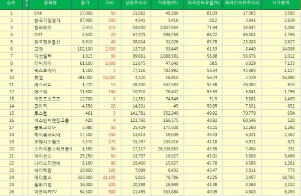 종목 외국인 보유율 10위권대를 기록한 종목은 에스씨디(외국인보유율(누적 순매수) : 약 54.59%, 현재가 : 1270원), 에스텍(외국인보유율 : 약 53.53%, 현재가 : 11500원), 액토즈소프트(외국인보유율(누적 순매수) : 약 51.9%, 현재가 : 12700원), 모아텍(외국인보유율(누적 순매수) : 약 50.95%, 현재가 : 4550원), 로스웰(외국인보유율(누적 순매수) : 약 49.92%, 현재가 : 461원)이다.