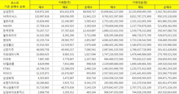 이 밖에 10위에서 20위 기관 순매수 종목으로는 이마트(약 2586억원, 210만주 순매수), SK텔레콤(약 2495억원, 99만주 순매수), KT&G(약 2424억원, 246만주 순매수), POSCO(약 2155억원, 95만주 순매수), 삼성화재(약 1948억원, 83만주 순매수), 오렌지라이프(약 1819억원, 634만주 순매수), 하나금융지주(약 1724억원, 514만주 순매수), 삼성바이오로직스(약 1625억원, 46만주 순매수), 대한항공(약 1505억원, 572만주 순매수), 삼성전자우(약 1416억원, 319만주 순매수) 종목이 기록했다.