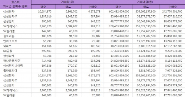 외국인은 지난 한주 동안 삼성전자(약 2427억원, 427만주 순매수), 삼성전자우(약 276억원, 58만주 순매수), 삼성전기(약 186억원, 14만주 순매수), SK하이닉스(약 178억원, 18만주 순매수), SK텔레콤(약 177억원, 7만주 순매수), 셀트리온(약 158억원, 9만주 순매수), 엔씨소프트(약 132억원, 2만주 순매수), 이마트(약 121억원, 10만주 순매수), KB금융(약 92억원, 19만주 순매수), 삼성화재(약 84억원, 3만주 순매수)를 했다.