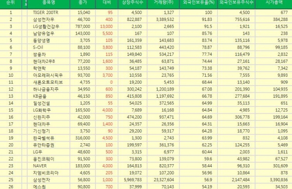 종목 외국인 보유율 10위권대를 기록한 종목은 새론오토모티브(외국인보유율(누적 순매수) : 약 68.44%, 현재가 : 4735원), 하나금융지주(외국인보유율 : 약 67.08%, 현재가 : 34950원), KB금융(외국인보유율(누적 순매수) : 약 66.78%, 현재가 : 46150원), 일성건설(외국인보유율(누적 순매수) : 약 64.99%, 현재가 : 1205원), LG화학우(외국인보유율(누적 순매수) : 약 64.84%, 현재가 : 165500원)이다.