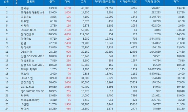 종목 주가 하락률 10위권대를 기록한 종목은 케이씨텍(주가 하락률 : -3.15%, 현재가 : 23050원), DB하이텍(주가 하락률 : -3.1%, 현재가 : 28150원), 신한 S&P500 VIX S/T 선물 ETN B(주가 하락률 : -2.95%, 현재가 : 10850원), 대성홀딩스(주가 하락률 : -2.86%, 현재가 : 7810원), 삼성 S&P500 VIX S/T 선물 ETN(H) B(주가 상승률 : -2.84%, 현재가 : 10620원)이다.