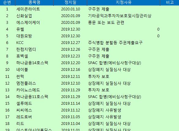 ▲ 종목명 : 유쎌, 유쎌 거래정지일 : 2019.12.30, 유쎌 거래 정지 지정 사유 : 0..(유쎌).