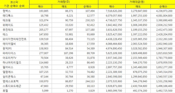 이 밖에 10위에서 20위 기관 순매수 종목으로는 아프리카TV(약 17억원, 3만주 순매수), 하나머티리얼즈(약 16억원, 8만주 순매수), 펄어비스(약 16억원, 0만주 순매수), 엘엠에스(약 15억원, 7만주 순매수), 실리콘웍스(약 15억원, 3만주 순매수), 엠에스오토텍(약 15억원, 24만주 순매수), 스튜디오드래곤(약 14억원, 1만주 순매수), 휴젤(약 14억원, 0만주 순매수), 원익QnC(약 14억원, 8만주 순매수), 유니테스트(약 14억원, 9만주 순매수) 종목이 기록했다.