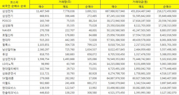 이 밖에 10위에서 20위 외국인 순매수 종목으로는 삼성전자우(약 51억원, 10만주 순매수), LG이노텍(약 50억원, 3만주 순매수), 현대엘리베이(약 47억원, 7만주 순매수), 삼화콘덴서(약 45억원, 8만주 순매수), SK텔레콤(약 39억원, 1만주 순매수), 이월드(약 36억원, 66만주 순매수), 현대모비스(약 34억원, 1만주 순매수), 한솔테크닉스(약 31억원, 30만주 순매수), 카카오(약 30억원, 1만주 순매수), SK케미칼(약 26억원, 4만주 순매수) 종목이 기록했다.