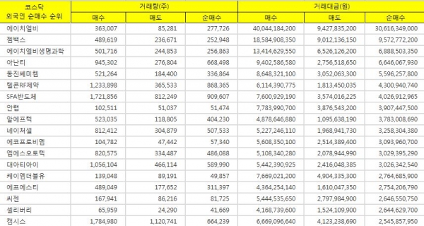 이 밖에 10위에서 20위 외국인 순매수 종목으로는 에코프로비엠(약 30억원, 5만주 순매수), 엠에스오토텍(약 30억원, 48만주 순매수), 대아티아이(약 30억원, 58만주 순매수), 케이엠더블유(약 27억원, 4만주 순매수), 에프에스티(약 27억원, 31만주 순매수), 씨젠(약 26억원, 8만주 순매수), 셀리버리(약 26억원, 4만주 순매수), 캠시스(약 25억원, 66만주 순매수), 위메이드(약 24억원, 8만주 순매수), 슈프리마(약 21억원, 6만주 순매수) 종목이 기록했다.