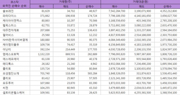외국인은 지난 한주 동안 솔브레인(약 43억원, 4만주 순매수), 파라다이스(약 36억원, 17만주 순매수), 케이아이엔엑스(약 27억원, 7만주 순매수), 헬릭스미스(약 26억원, 2만주 순매수), 대주전자재료(약 25억원, 13만주 순매수), 펄어비스(약 23억원, 1만주 순매수), NHN한국사이버결제(약 20억원, 9만주 순매수), 케이엠더블유(약 19억원, 3만주 순매수), 아난티(약 18억원, 17만주 순매수), 엠에스오토텍(약 18억원, 26만주 순매수)를 했다.