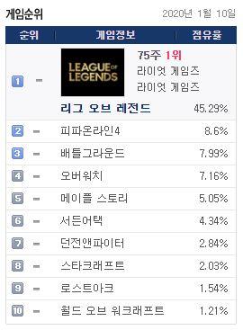 [11일 PC방 RPG온라인게임 점유율 순위] 75주 1위 리그 오브 레전드(롤,lol 인벤 갤러리) 올라, 피파온라인4 (8.6%) 2위, 배틀그라운드 (7.99%) 3위, 오버워치 (7.16%) 4위, 메이플 스토리 (5.05%) 5위 순으로 기록