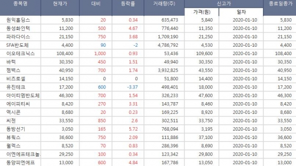 같은 기간 52주 신저가를 기록한 종목은 이에스브이(신저가 일자 : 2020-01-10, 현재가 : 164원), IBKS제7호스팩(신저가 일자 : 2020-01-10, 현재가 : 2070원), IBKS제10호스팩(신저가 일자 : 2020-01-10, 현재가 : 2045원)이다.
