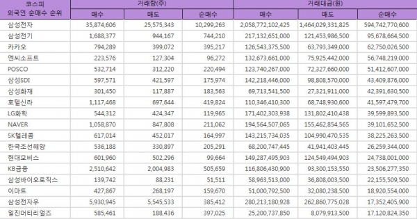 이 밖에 10위에서 20위 외국인 순매수 종목으로는 SK텔레콤(약 382억원, 16만주 순매수), 한국조선해양(약 262억원, 20만주 순매수), 현대모비스(약 247억원, 9만주 순매수), KB금융(약 235억원, 50만주 순매수), 삼성바이오로직스(약 221억원, 5만주 순매수), 이마트(약 189억원, 15만주 순매수), 삼성전자우(약 173억원, 38만주 순매수), 일진머티리얼즈(약 171억원, 39만주 순매수), 하나금융지주(약 161억원, 46만주 순매수), LG(약 160억원, 22만주 순매수) 종목이 기록했다.